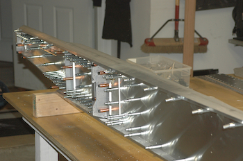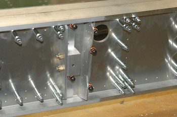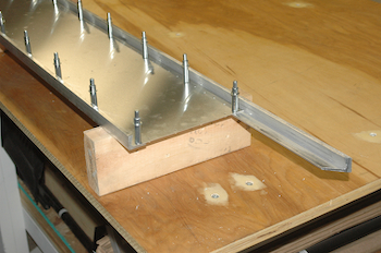 After all the tweaks and double checks it was time to drill. I started at the far end because access was easier and the kit supplied three spacers to use in that part of the spar. In the picture below you can see that I drilled through every fifth pilot hole from the end. A spacer was placed every 10 pilot holes – including the end – and I used a clamp across the spar to squeeze the caps together onto the spacer. Drill four holes add clecos, remove the spacer, reattach the spacer 30 holes down and repeat. A little more than halfway down the spacers can’t be used anymore. However, at this point the spar and the main web are now locked together fairly well and kept in place by the additional web material. As a double check, I used my square with the 90° head and the angle measuring head also set for 90°. The two heads were set 7 19/32 apart and I could slip it over the spar caps and make sure they were squeezed in just right. I didn’t get a picture of this but I will tomorrow. These are two pictures of the spars after the first pass of drilling.. |