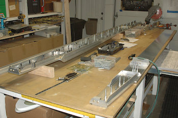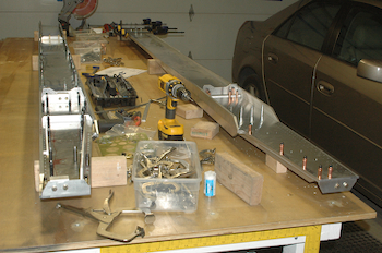 These two pictures show the right spar starting to be laid up. The left spar is also in the picture. All holes have been drilled in the left spar to the final size, as well as countersunk and dimpled as required. There is still a lot of work on the left however, it needs to be deburred and all the pieces need to have all of the tooling marks removed. That’s a big job by itself. Then it has to be riveted with solid rivets, which is what I have been dreading. The plan is to deburr and clean up both spars at the same time. Then I will rivet one right after the other. These two pictures show the right spar with the various angles now attached with a few clecos. Like the left spar at this point, all the holes are smaller than finished size. The spar caps have been attached in these two pictures but they have not been drilled yet. I have clamped the far end together in preparation for drilling them. |