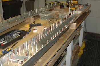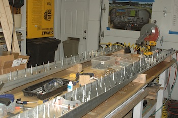 Today I finished drilling out all the holes outboard of the wing root rib attach angle to the final hole size. That is two sizes up from the pilot size hole for almost all of the holes. I put in and took out a lot of clecos over two hours. That was a trivial task for the compressor. After it pressurized, it never got to below the repress value before I was finished with it. The second shot shows the holes and clecos in virtually the same arrangement as the left spar. |