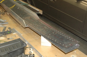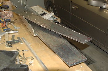 These pictures show the finishing up of the dimpling and countersinking. In the first, the top dimpled layer is rolled back so that I can drill the countersinks in the top spar cap. The second one shows countersunk center web all finished. The first picture below shows the finished dimpled top layer and the second picture shows the Right Main Spar reassembled and completed to the same stage as the Left. |