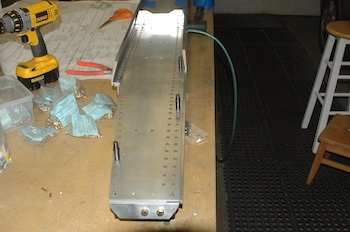 Well, like I said I would last time, I took it real slow yesterday just to make sure everything was just right. Several of the pieces needed minor touch ups but no issues after inspection. The next thing I did was construct a test piece for round head and flush head rivets. I drilled enough holes to rivet 10 of each. After six of each kind, I had the pressure set right and the timing was also good so I went ahead and set up four of each kind and did a test production run of eight rivets. They came out looking terrific. They are the left most four of each row in the two pictures below. The upset heads are all well within tolerances. The flush rivets are flush and the round head rivets flatten the same way and amount as with the bolt method. Good to go. I started by reviewing the plans carefully and getting all the rivets in the correct location. Lots of size changes and type changes as the angle pieces have several different thicknesses and depending on location the rivet may or may not be a flush head. This shot is after all of the flush heads have been inserted. |