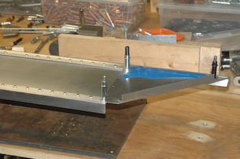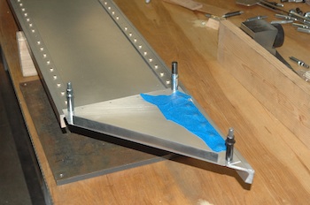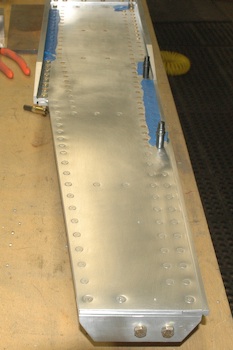 Well, mostly riveted. All the rivets that I plan on riveting now are done. I still have 20 out of almost 300 to do. This first picture shows the remaining rivets. The nearest stretch of blue tape with the two clecos is all that remains. These rivets are inaccessible when using the rivet gun. I will have to use the bolt method and a modified bolt at that. This is not a surprise and even if I had used the bolt method all the way through I would still have saved these for last. My plan is to do them when I do the same ones on the Left Main Spar. These pictures are after doing the bulk of the rivets in the outboard section of the spar. The rivets under the blue tape have the heads reversed. My rule for riveting the spar is factory head on the thin web material and upset head on the thick spar material. The spar had to be turned over here to do these rivets and some others. |
