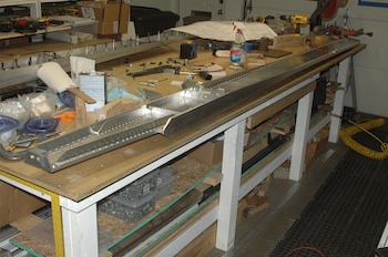 These pictures show both sides of the spar just before I finished the last of the rivets with the gun. These pictures show the “Sonex bow” that most everyone has reported after riveting the spars. I would have been alarmed if I hadn’t known it would happen. It is the result of differential expansion of material on the top and bottom as the rivet is formed. The second picture is a smaller example that showed up in my test piece. In articles on riveting, I read of methods to minimize it but opted not to. It takes very little force to make it straight. I tested it by laying the spar with the bend up with a board near the start of the thinning part of the spar cap. I then laid a two pound sledge hammer at the tip and the spar was straight while the hammer was sitting there. |