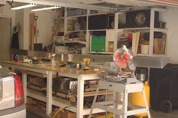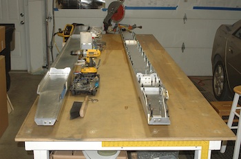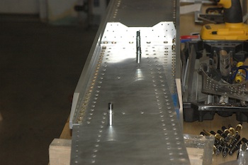 After finishing up the riveting on Saturday I found I spent most of Sunday just looking and not doing any work. I was so unproductive, I visited the RV guys and showed them my rivet sample, looked at their cowling work and watched them test fit an induction air intake and their baffles. Then we sat around and talked and I pretty much ruined their productivity as well! Before I visited the RV guys, I did test fit the wing in the garage. With clecos in place on the Left Main Spar I couldn’t connect them, but I could set them up close to each other and get the first overall glimpse of the scale of the wing in the garage. The garage door was closed with the near end about an inch inside of it, and the far end was a good 8 inches inside of the far wall. Plenty of room. The second picture is the start of today’s work. The table is all cleaned up, the spar positions are reversed and I just have to take apart and clean up the Left Main Spar. After I took apart the spar, I test fit the mating surface against the Right Main Spar. It fits and clears all rivets and bolts. |