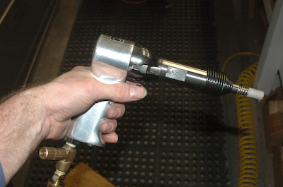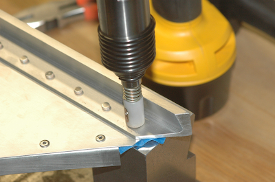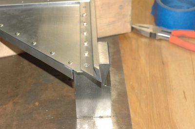 Here are the rivets all the way down to the very last one accessible to the rivet gun. The second picture above shows the positioning of the bucking bar. It is sitting on a steel plate and the rivet factory head is resting on the top of the bucking bar. This is just how it should be set up for back riveting with the Sonex Rivet Tool. Just strike the top of the rivet shank about three times and the rivet is set. I replace the Sonex Rivet Tool with a 3x rivet gun borrowed from my RV building friends and use the back set tool. This back set tool has a collar that helps keep the gun from wandering off the rivet shank. The surface inside the collar is flat like a flush set tool. All of these rivets on the outer spar are the same and the pull time with my metronome is a – ONE AND TWO – count at 120 beats per minute. That’s .75 seconds, with 90psi and a full pull on the trigger. The set rivets next to the tool show the result. |