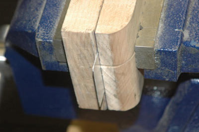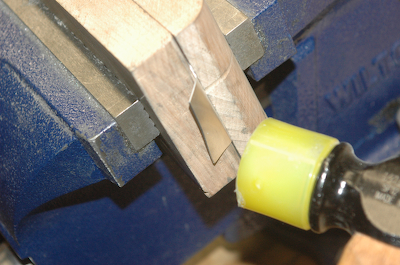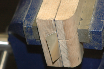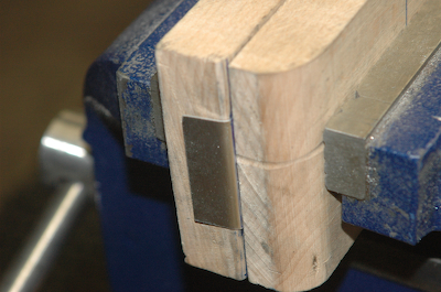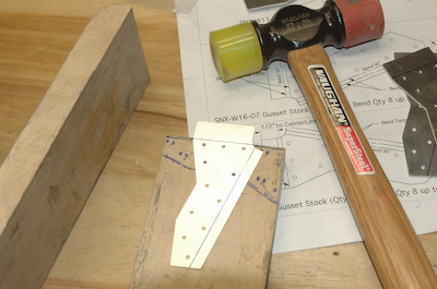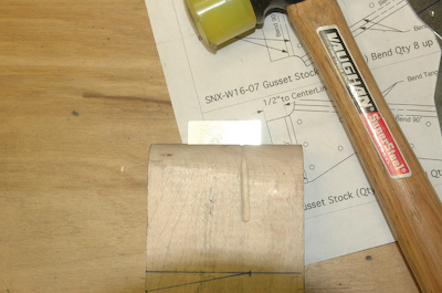 After the spacers I need to form the rib gussets. These are supplied flat and need to be formed. I have to mark them up and then make two bends in each. There are a total of 32 for the common ones (64 bends). I use my oak pieces with one end having a 1/16” radius on it. I just form them by hand. This series of pictures shows the forming process. Hit with hammer. |