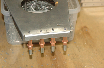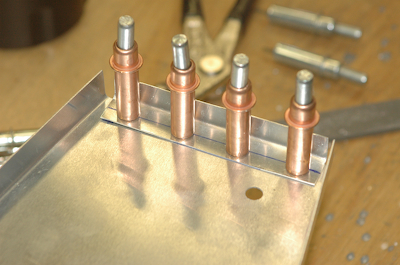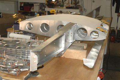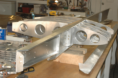 These pictures show all four, fore and aft ribs finished and mounted. The second picture has a plans page doing a stand in for the aluminum wing skin. After finishing the left ribs I started on the right. Mostly they are identical, but the #1 aft rib has its end flange cut off and replaced with an angle offset forward 5/32”. The rear spars are slightly different as shown below these first two pictures. This mod accommodates the difference. I also had to modify the #5 aft right aft rib a small amount because of the fact that the left and right rib flanges all bend the same way. On the right wing there is a small interference with the spar cap taper that doesn’t occur on the left wing because of the 1/2” difference of where the corner of the flange meets the spar cap. I’ve also cut the blanks for the root rib gussets and mostly finished riveting the right ribs, just no pictures since it is all the same. |