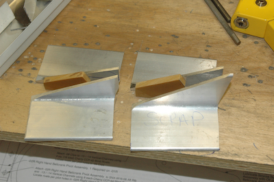 It was back to working on airplane parts today after a few days off. I will also be building tomorrow. I had cut the angles on two of the bellcrank angle parts. Here are the other two cut along with the two pieces of phenolic cut to size. I also had the eight clip blanks cut but they needed final trimming and pilot hole drilling. Here they are just before marking up for drilling. |