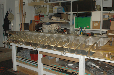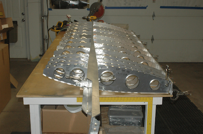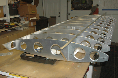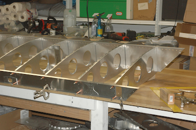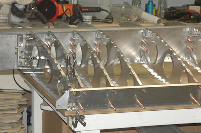 These two pictures show the whole wing with all but the root ribs installed. The second picture shows the wing turned around and squared up. The aft root rib must be installed with the wing squared up so that it will fit properly. These pictures show the squared up wing in more detail. The first picture highlights one mistake I made in laying out the rear spar. The predrilled holes in the rear spar did not match the holes in the rib. I didn’t notice that I had drilled the hole wrong place until after I went to enlarge it. It is the only hole in both rear spars that did not match perfectly. I added a hole in between because the misalignment is quite large. I will add a backing strip to the rivet in the bad hole. |