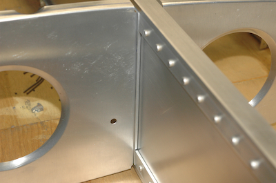 In the first picture below you can see the detail of the spacers used with some of the ribs. The main spar is made up of layers of material and at different places it is different thicknesses. Since the ribs are all the same size spacers are added as needed so they all line up perfectly. This rib has two spacers, a thick and a thin one to compensate for the center web and the aft web, which don’t run this far out on the spar. The second picture shows all of the frames completed for the day. However at this point I had problems with three rivets that I had to replace. These two pictures show a temporary/permanent fix. What happened was, two rivets did not sit flat against the spar. The rivets were very hard to access here with the thickening of the spar cap, the gussets and the narrower spacing of these three ribs. I tried to drill out the first one but enlarged the hole. I went to drill out the second one and got my ribs crossed up and drilled out the wrong rivet! Worse the drill bit broke in the hole and that hole also ended up enlarged. I drilled out the other bad rivet with no problem. I wanted the same solution for all three. Because of the enlarged holes I could not use the blind rivets. I have larger diameter blind rivets for just such a problem but they are a little too short for the thickness here. I also have bucked rivets that would be just the right length, however I think they would be really hard to buck now that the ribs are in place. I also have bolts that are the same diameter at the bucked rivets. I decided to drill out the holes to the size of the bolts and bucked rivets and put the bolts in. If I can figure out how to buck the rivets I will replace the bolts, otherwise the bolts stay. |