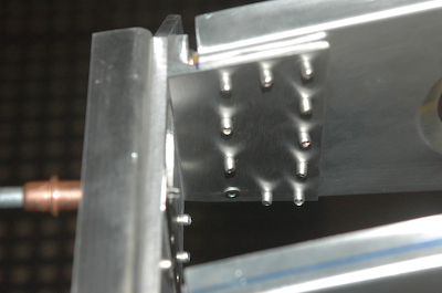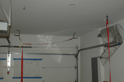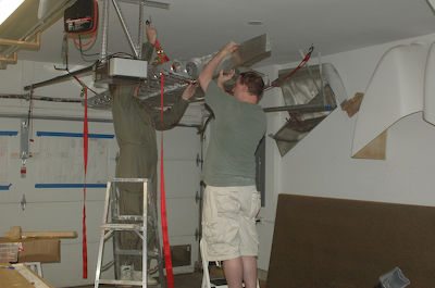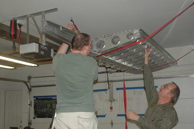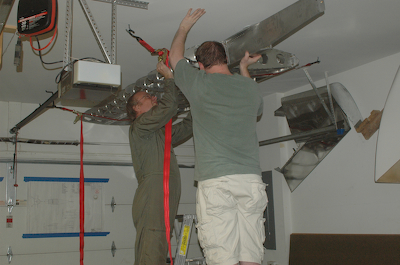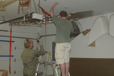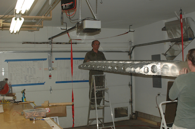 After fixing the bad rivets on Saturday it was time to rivet the rear spar to the aft ribs. The pictures below show the only tricky spot. The rivets would normally all go in from one side, but as you can see, the lower, rearmost rivet was put in from the opposite side as the rest. I had a clearance issue and this works just fine. After riveting the rest of the aft ribs to the rear spar the frame for the right wing was complete and ready for storage. The sequence of pictures below show the hanging of the completed frame. I rigged up two ratcheting straps to the garage ceiling and with the help of my son stored the frame in the space between the ceiling and the open garage door. It looks wonderful. Who is that guy in the military surplus flight suit? Oh, that’s me in my favorite acquisition at Oshkosh. It fits great and I look MARVELLOUS. |