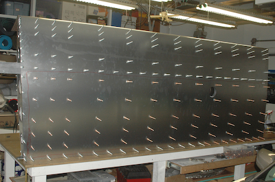 Starting from the center of the wing and moving towards the leading edge and out to each side, drill the holes to attach the skin.