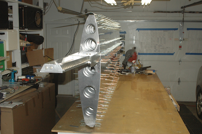 The remaining pictures are various views of the wing standing on end in the process of turning it over to attach and drill the top of the forward skin.