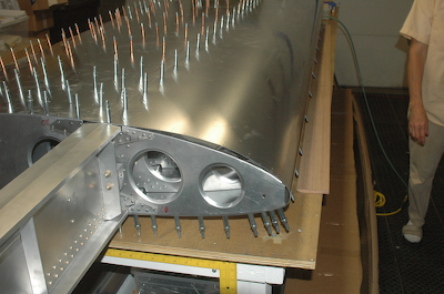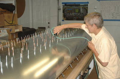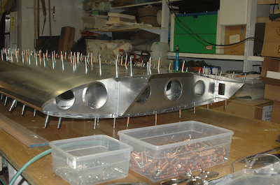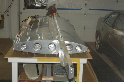 This is were everybody has pictures showing their rig for pulling the leading edges skin tight enough to attach it to the spar – usually with ratchet clamp belts running over two by fours. This is also where you find out if the skins are square with each other and in alignment. I figured I would have my picture of that setup as well, hopefully with aligned skins. The first picture say’s it all. With a helper and a properly drilled wing it aligned perfectly and I was able to push the skin into position so that Kathy could drive home the clecos. No ratchet belts. The secret to being able to push the skins into position was the piece of oak molding visible in these pictures. I was able to position it a couple of inches from the leading edge and – distributing my weight by placing my hands about three feet apart – pushing down first and then towards the spar. On my first attempt, I was able to see that the holes lined up great and that if I held it firmly and for a long enough time someone else could insert the clecos. I called Kathy and when I said go, she had three clecos in in seconds. She then went up and down the line while I continued to push and it was on. The remaining pictures show the wing how I left it for the day. The next step is to drill the top holes working toward the leading edge just like the bottom side. |