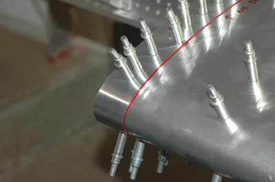 The last post showed the forward skin fully attached to the bottom ribs and spar, but only attached at the spar on the top. The first task was to start drilling the top part of the forward skin. These two pictures show that step in progress. After it is all drilled to the pilot hole size, it was time to add the root/wing walk doubler. On the right wing the doubler is about two inch wide all around and is the skin the can be trimmed to fit the wing edge to the fuselage. On this wing, the left one, the portion of the doubler that goes over the top aft skin is about 15 inches wide and serves to double the skin thickness in the wing walk area. The edges of the root doubler have been highlighted in red in the second picture. The remaining two pictures show the edge in detail. |