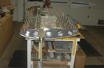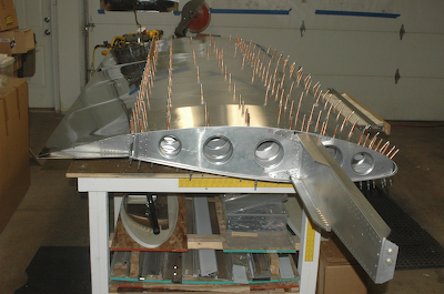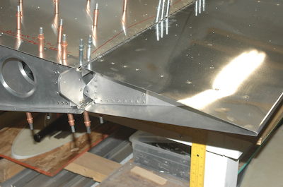 These two pictures show the full wing with the flap propped up unattached into its approximate position. These two picture are showing the wing top side up. The remaining pictures from here on in this post are with the wing turned over, bottom side up. These pictures are after all of the bottom side holes have been updrilled and the flap hinge has started to be fitted. |
