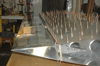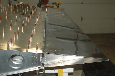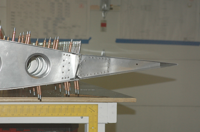 Here are some more pictures of the flap and aileron. You can see the nice straight edge of the rear spar. When I had the aileron and flap sitting next to the frame, you could really see the bend in the spars. Attaching the skins has taken that bend right out. In these two pictures you can see how the bottom edge of the aileron has a large gap between it and the rear spar. That is because the aileron moves up and down while the flap only moves down. (Remember, the wing is upside down) All that is left to do is updrill the flap hinge holes. |