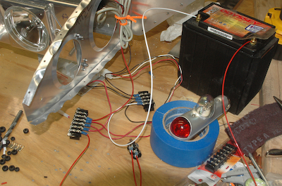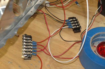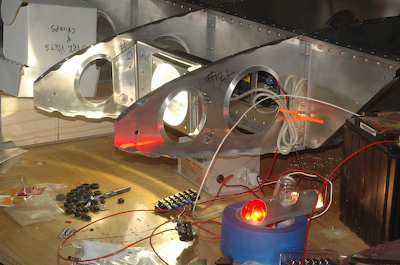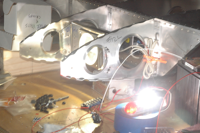 So what do you do after hanging the light? Light it up of course. The Aeroflash isn’t even mounted yet but I wanted to see it all working. A quick trip to Radio Shack for some throw away connectors and buss bars… …and you have lights. The first picture is in between flash cycles while the second one captures the flash. |
