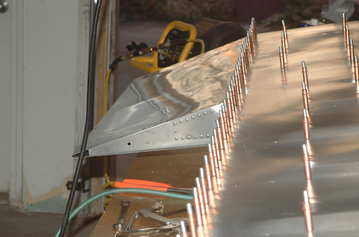 It’s been an exciting week – time for the big finish. Before starting the rivets, I adjusted the aileron push rod where it attaches to the aileron. It was biased to the up side quite a bit. I coarsely set the neutral angle and adjusted to be able to get full down and up motion. This was just a rough adjustment to get it close. It will be redone. These two pictures show the start of riveting. The rear spar is about half way done. The second picture shows the root doubler at the wing walk area. As I said previously, this gets riveted much later. |