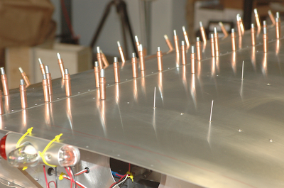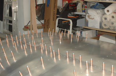 The march of the rivets continues. Most of the aft top skin has been riveted.