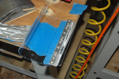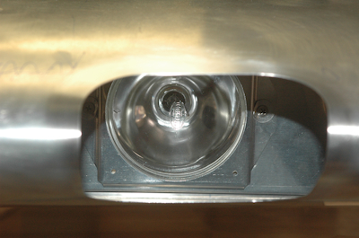 The first picture below shows the landing light through the hole. The second picture shows the plexiglass lens after I have cut it to size and am giving it its final fitting. This picture shows the lens in place. It still needs cleaning and finishing around the edges to prevent cracking. The lens was completely covered in blue tape for most of the fitting to protect it from scratching. |