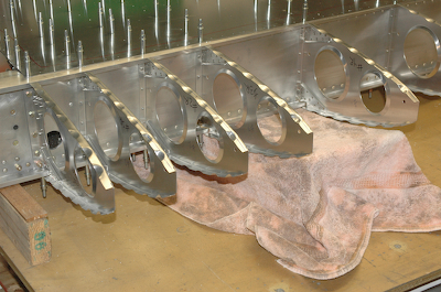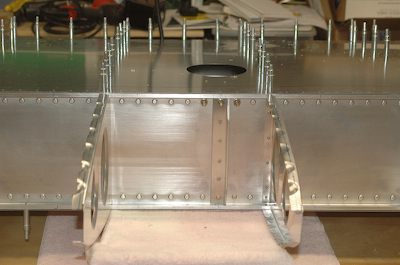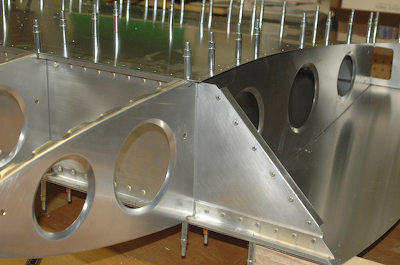 Nothing has happened beyond the previous page in these four pictures. I just took these to show what I spend a lot of time looking at doing nothing. I just love the wing in this stage. With both aft skins on and no leading edge skin, the view is a hybrid of the pure frame and the box beam formed by the skins and spars. The scale of all the pieces, rivets, spar caps, spar web and aft skins that make up the primary wing box area just look strong, purposeful and well engineered. It has been a pleasure to build and have all these pieces come together correctly. I waste a lot of time staring at it so I thought I would share them, I’ll understand if they don’t have the same impact on you as they do on me. |
