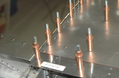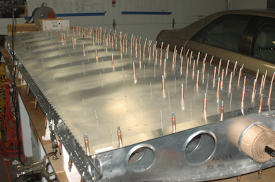 First rivets on the right wing skins. The wing is upside down so these rivets are on the bottom trailing edge. I have the flap mounted while its hinge is being riveted in place. These two pictures show the advancing rivets with the second picture showing all the rivets on the aft skin done up to the spar cap rivets. The flap has been removed for better access now that its hinge is attached. |