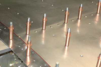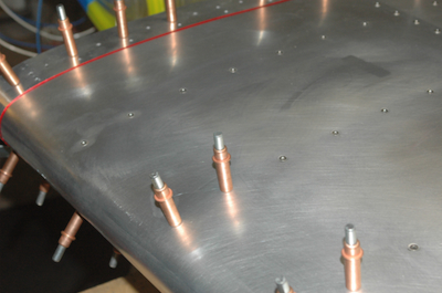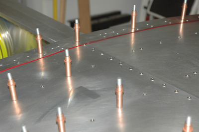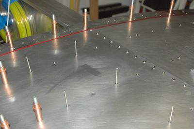 These two pictures show the progression of riveting along the spar cap. These are the first rivets in the leading edge skin. It can’t come off now. The first picture shows the spar cap rivets all in place and the second picture shows the start of the riveting the leading edge to the ribs. In the fourth picture the riveting has continued and one rib is completed . |