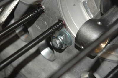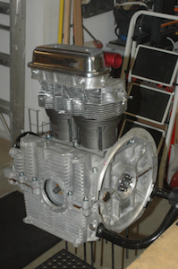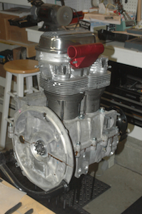 Other than the flywheel assembly, this main case bolt was my only other problem. I had let the gasket material set for a couple of minutes and then joined the cases. They went together very well. I then quickly started all six case nuts. Five started with no problem and I got those fully run on ready to tighten. This one would not start. It was second in the torque order so I did the first bolt to its initial torque value and examined this nut more closely. The nut threads were fine, but when I looked at the bolt thread, the first full thread was smashed over and there was no way the nut would start. The only way to start the nut was to file the first thread off, but with the engine opening I didn’t want any file dust to get inside. I quickly covered all the push rod holes and cylinder holes with 2” wide blue painter’s masking tape. I then filed off the thread and was able to start the nut. I cleaned the file debris and then removed the tape. I ran the nut on and torqued it to its initial value. After the final torque values were applied to all the case nuts I checked the nut and as I suspected it would, the nut had run past the first thread and filing it off was of no concern. These two pictures show a test fitting of two cylinders, the cylinder head, rocker cover and intake manifold fitting. The engine is turned on its side in these pictures. |