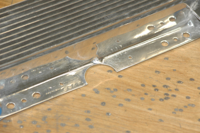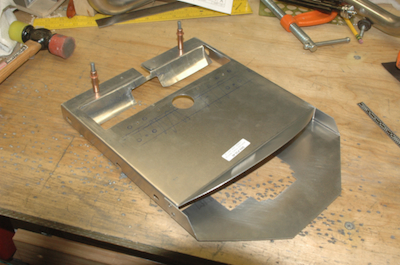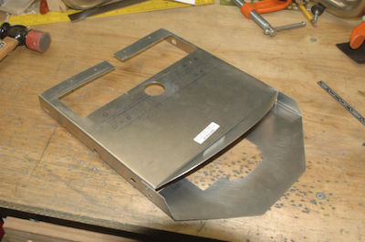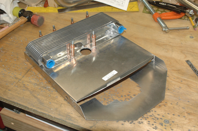 Picking right up were I left off, here are six pictures of the fabrication of the oil cooler. The first two pictures show the supplied pre-cut sheets. I had to form the angles and in the second picture, make the cut out were the flow of air is deflected through the cooler. The oil cooler is optional, and if you don’t add it, the shroud just channels the air over the bottom surface of the engine, which is the oil sump. The next two pictures show the deflector that I fabricated from scrap and its location on the shroud. The last two pictures show the oil cooler itself with a half round hole cut into it and the cooler mounted on the shroud. The hole is for the oil drain hole and also will house the oil temp sendor (my case has a blockoff plate at another location that can be used for the oil temp sendor but I have to drill and tap the hole. I may do that). The oil cooler fabrication is finished but it will not get mounted until engine installation time. |