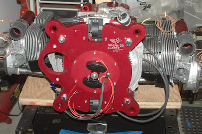 These first two pictures show each magneto, 180º apart. You can’t see the adjusting shim in these pictures, but a thin, 0.010” shim is between the magneto and the magnet. Tighten them down and that is the only adjustment required. These two pictures show the plate that holds both the alternator stator coils and the electronic ignition triggers. The electronic ignition fires when the little trigger magnets pass by. This little magnet may need to be advanced or retarded slightly so that firing takes place at the same time as the magnetos. Once it is set however, no adjustment will be necessary. The stator coils of course are where the 14 volts of the 20 amp alternator are generated by the passing magnets. The heavy dark wire contains the alternator leads that go to the voltage regulator. All of these components are the stationary halves of each device. |
