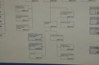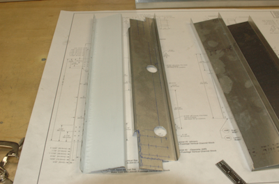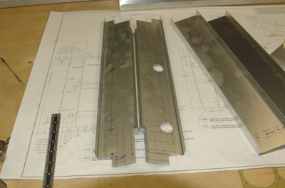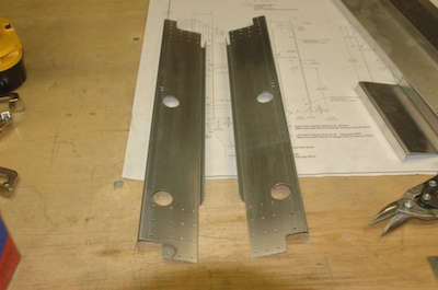 On to another plans page. These four pictures show the progress of making the left and right forward channels of the aft section. They are a little more complicated than the other channel pieces for the fuselage. They are pre-bent in a Z shape with one angle at 90° and the other in the opposite direction that is less than 90°. I was very careful in marking them up to get the big holes on the side closest to the shallow angle edge. Of course you get used to making a lot of reflected parts but this one was tricky. So tricky, that in the first picture below, I have just realized that I MADE THEM WRONG!!! The first picture is just how I made them, with the shallow angle edge coming up instead of going down. My jaw dropped as I looked at them and realized I had not interpreted the drawing correctly and was sure I had just screwed up. I also had no more of this stock. After a few minutes of pondering and wondering if I could salvage them. I realized that because of the reflection, the right one should work for the left and vice versa. The second picture shows them turned upside down and reversed left to right and they will work fine. Luckily there was no hole or cut that didn’t reflect symmetrically for this outcome. If I hadn’t confessed no one would know. Sure, the left was made for the left, why do you ask? |