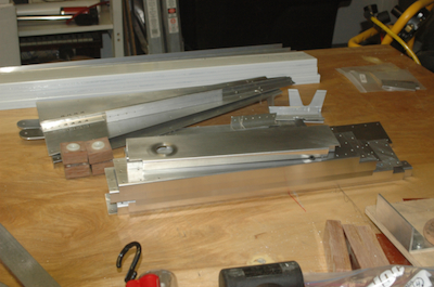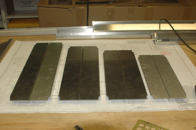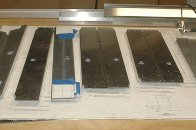 After that scare, it was time to make the rest of the vertical channels. Three of these pairs are made from the same stock – shown in the first picture. They have all been finish cut to size. The second picture shows the common end treatments. These two pictures show all the pieces with some additional large holes drilled and lined up with the Z vertical channel. The smallest pair of channel is now done. The three middle pair all share the same pilot hole patterns along the top and another pattern along the bottom. My templates are shown in the first picture and all the holes are drilled in the second. With the four fairleads remade and these vertical channels done. Another plans page is complete and off the parts go to the finished pile. |