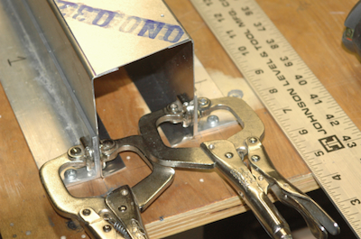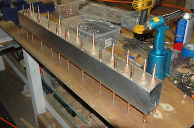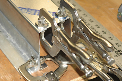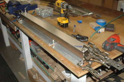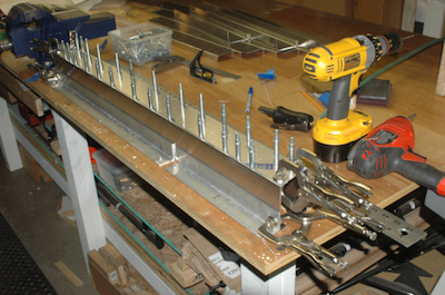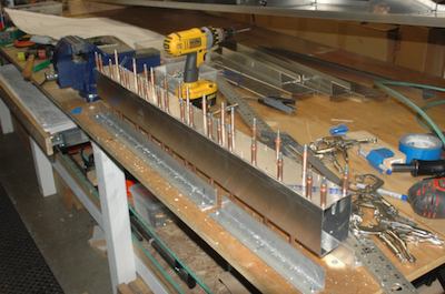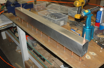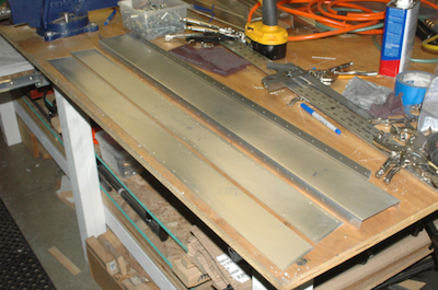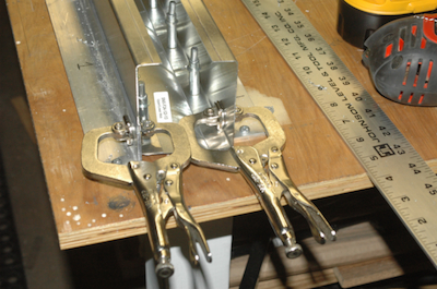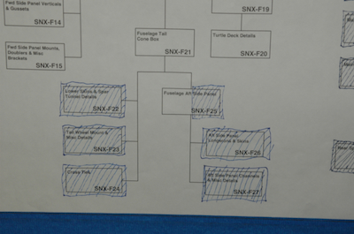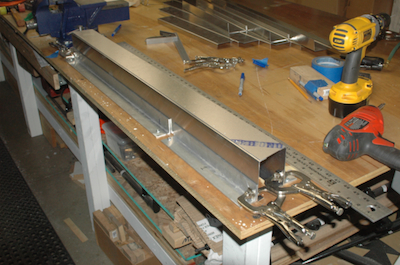 After finishing the cross ties, I have to make this assembly. It uses two crossties that I cut and two flat sheet kit parts to form a box beam. I used my aluminum jig pieces to fix the pieces in place, three inches apart. I want this square with no twist. The kit parts have pilot holes predrilled. After fitting the top piece I drilled it out. To do the other side, I transfer the clecos to the inside. Although it will now rest on the small parts of the protruding clecos, it will still rest snug in the jig. Repeat the pilot drilling, updrill, deburr and clean and the cross tie plan page is done – the bottom of the box beam is riveted later. |