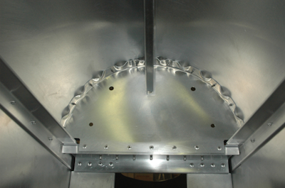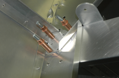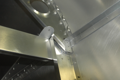 Then it was time to get up from underneath again to fit the number three and four pairs of formers. So the bottom came off again and the whole unit was slide out over the edge of the table again. The second picture below shows the former loosely in place. After both have been clecoed in place – including to the upper clip – they are then riveted. In the next two pictures the left side is done and the right is next. The clip has to be riveted as well and also the aft former is riveted. |