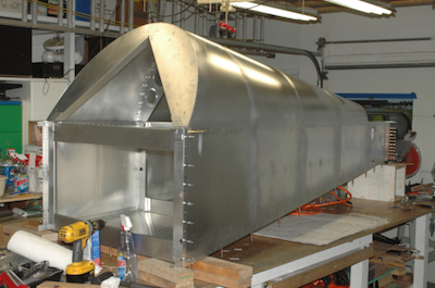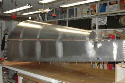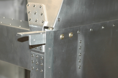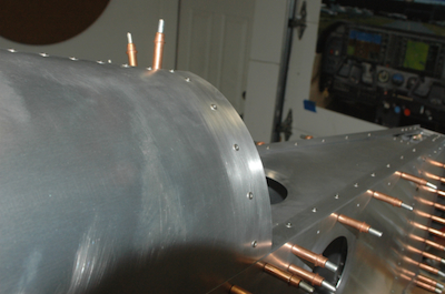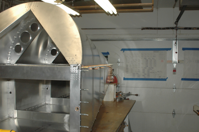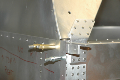 The first picture shows the aft former with half of its rivets in place. The next picture? All done. What, no progress pictures? Not here, but you can see the progress in a little feature I call... The next two pictures are before and after the side skin, turtle deck skin and longerons are riveted in place. These last two pictures show the location of the final two bolts per side that have their nuts inside of the cross tie box beam. That forest of clecos in this corner is now gone. Completely replaced with rivets or bolts. |