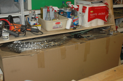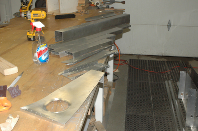 Did I say lots of pieces with lots of holes? I did, and here is a photographic inventory of all those pieces - and holes. The bottom skin and the turtle deck skin. All the formers, angles, clips splice plates and minor assemblies. All the cross ties. And both of the side skins with there upper longerons detached. Here is the major advantage of building the whole thing. When I deburr, I will be able to do all the holes easily. If I built the lower box first, deburring of the upper longerons and the channels that attach to the turtle deck formers would be much more difficult because the pieces no long come apart. I have found that getting out all the burrs between pieces already attached can be a real problem. No problem for me here. I put all the loose pieces aside so I could work on the bigger ones on the table. |