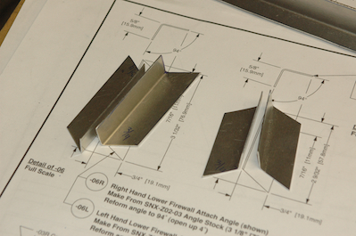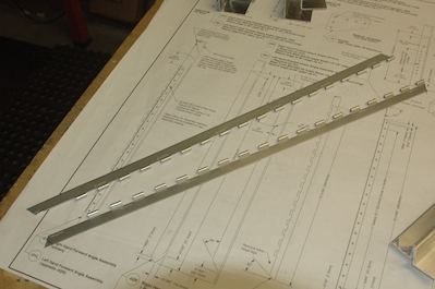 It was a dark and stormy night… I feel that I should write some meaningful prose here to describe my lack of progress over the last four weeks. Not a lot to say really. I got sick, Kathy got sick. Kathy got sick again! I did manage to get about five hours of flight time in despite the weather. Mostly I seem to have hit a mental wall cutting all the forward fuselage angle. I wouldn’t call it hard or tricky but it is time consuming and somewhat boring. My mind has drifted which has caused some stupid mistakes and I seem to take every opportunity to leave the shop. Hmmm, too bad the new $2000 optional pre made angle pieces were not available when I ordered my kit. It would definitely be worth it. Well over half of the 70 plus angle pieces in the optional kit are in the forward fuselage. So let’s see what I actually did over the last four weeks. Here are four simple angle pieces. And here are two trimmed hinge pieces, and two more angle pieces that took all of about 30 minutes to mark up and cut. |