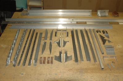 And here they all are. The parts beyond the four longerons are all the angles that go between the side skins. They are only cut to length. They don’t need a lot of shaping work but will need pilot holes before they are ready to assemble. All the ones in front of and including the longerons attach to the side skins. |