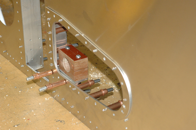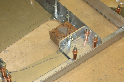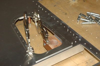 Then it’s some details. Although not called out on this page, I have done an initial installation of the flap drive phenolic blocks. They are temporarily held on with Home Depot Aircraft Supply bolts with a hole size smaller than final. I would prefer to find a way to drill them to final size out of the airplane. We’ll see. With the panel off the table I can now mount the doubler plate that goes on the other side of the skin. The panel is now all done with drilling for rivets. No bolt holes have been enlarged yet. It will stay this way until after the left panel is to this stage. |
