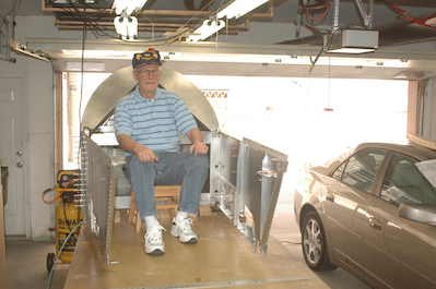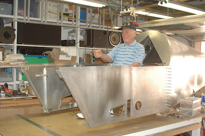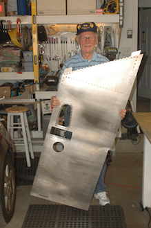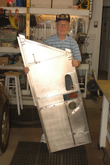 I didn’t take any pictures of us putting in the bolts, but Dad held the bolt while tightened them up. Here he is holding he finished panel, inboard and outboard sides. Then of course we attached both panels and took a seat. We also held up a number of pieces in their approximate location to get a feel for how the rest goes together. |