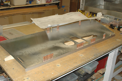 Here I have both longerons done and have also done a couple of other pieces. There isn’t a specific order to rivet. The pieces of wood are one inch thick and serve to hold the side panel up while attaching all the one inch angle pieces.