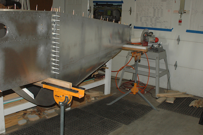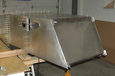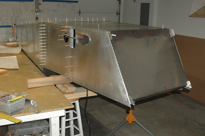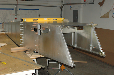 With all the crossties ready I made a small bend in the supplied forward bottom skin and two bends in the supplied firewall. It was then time to start installing all of those pieces. The question was how? Most of all the pilot holes – and all of the ones done first – were in the bottom skin. I decided it would be easiest to turn the assembly over and then drill the bottom skin to the lower longerons. The first two pictures show supports and the fuselage in its position for assembly. In the third picture, I have leveled the whole structure and test fitted the lower skin. I forgot to mark off the plans page when I finished all the cross members. Picture four shows the current status with the fuselage box assembly the next step. These two pictures show the firewall loosely fitted to check for any issues. It fits very well with no sign of the forward fuselage being out of square. I will not be fitted until the upper and lower crossties have been attached. Tomorrow we drill! |