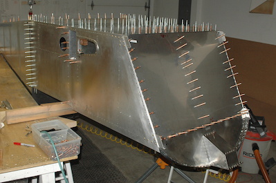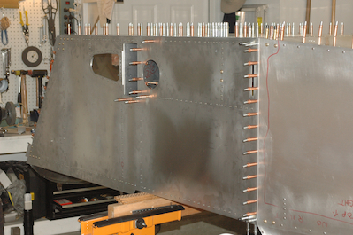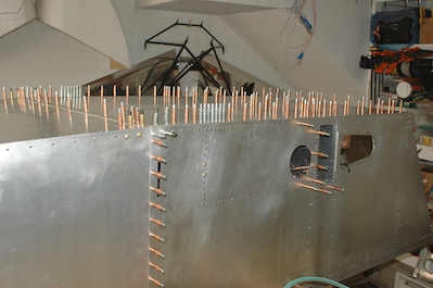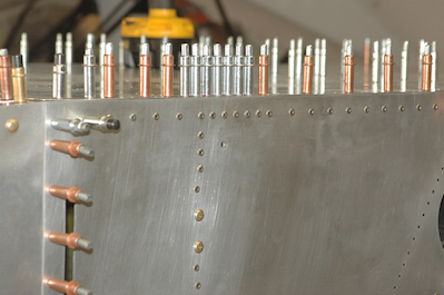 At this point I had all the inside pieces attached and also had fitted the upper firewall so I tried on the engine mount again just for fun. Then it was back to work drilling out all the remaining holes to final size. I started with the firewall. Then I did all the holes in the floor starting with the stiffener, then the spar tunnel and finished with the longerons. Note there are still some silver clecos. I have not updrilled the splice plates and the two groups of seven silver clecos get drilled to a gusset plate added on the next plan page. |
