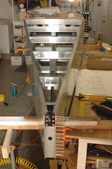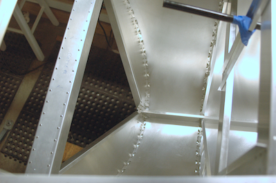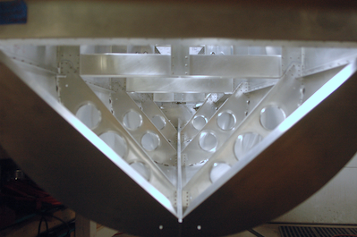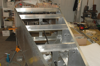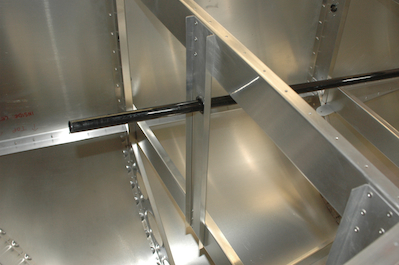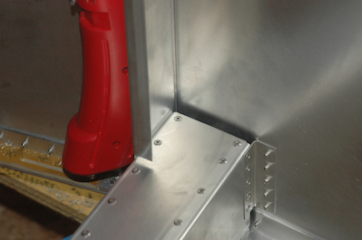 Up next was a long planned assembly. When I built the aft fuselage, I had not decided for sure if I was building the lowered seat mod. The position of two channel pieces is dependent on the choice. Now that the choice was made, I installed the two vertical channels that guide the elevator control rod. I took the bottom skin off to do this and some other work (remember, it is not riveted on for this very reason. It will be one of the last pieces riveted on the plane because of future access needs). The two rivets inside the channels of each of the next two pictures were the rivets I couldn’t get to when I finished the aft fuselage. I knew I would be turning it over so I waited until now to get them in. The last two pictures are just unusual views of the interior of the aft fuselage upside down with the bottom skin off. |